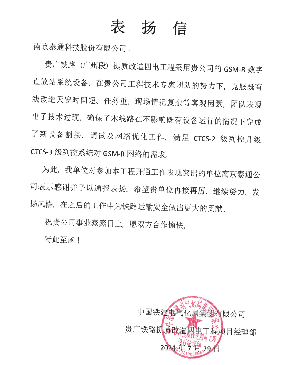 此封表揚信為公司未來的發(fā)展注入了新的動力與信心。接下來,泰通科技將繼續(xù)發(fā)揮專業(yè)優(yōu)勢,助力中國鐵路事業(yè)的蓬勃發(fā)展。