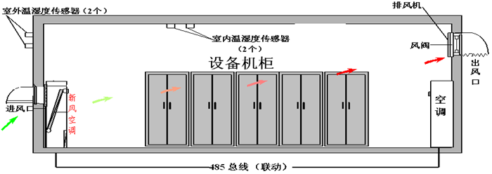 工作原理:模塊新風空調設備是結合新風與空調控制,對機房進行熱功控制的系統(tǒng),當室內溫度達到22℃(可設置),室內外溫度差△T≥2℃,模塊新風設備開啟,向室內送入過濾后的冷空氣,室內溫度降至18 ℃時,模塊新風停機;如室內溫度繼續(xù)上升至25 ℃時,模塊新風停機,模塊精密空調啟動制冷工作,室內溫度降至23 ℃時,模塊精密空調停止工作,等待下一個工作流程,以此循環(huán)工作。